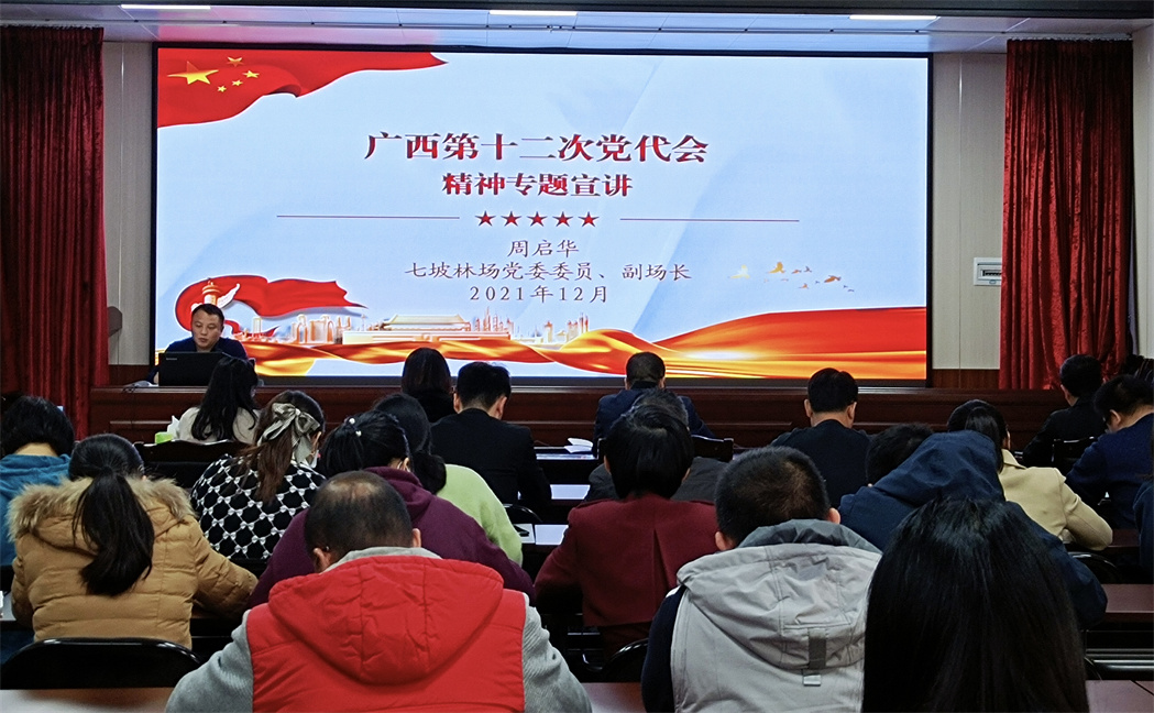 2021年12月17日,七坡林场党委委员、副场长周启华为机关第五党支部、新桥分场党支部和那琴分场党支部作党的十九届六中全会和自治区第十二次党代会精神宣讲报告。三个党支部党员干部共55人参加。