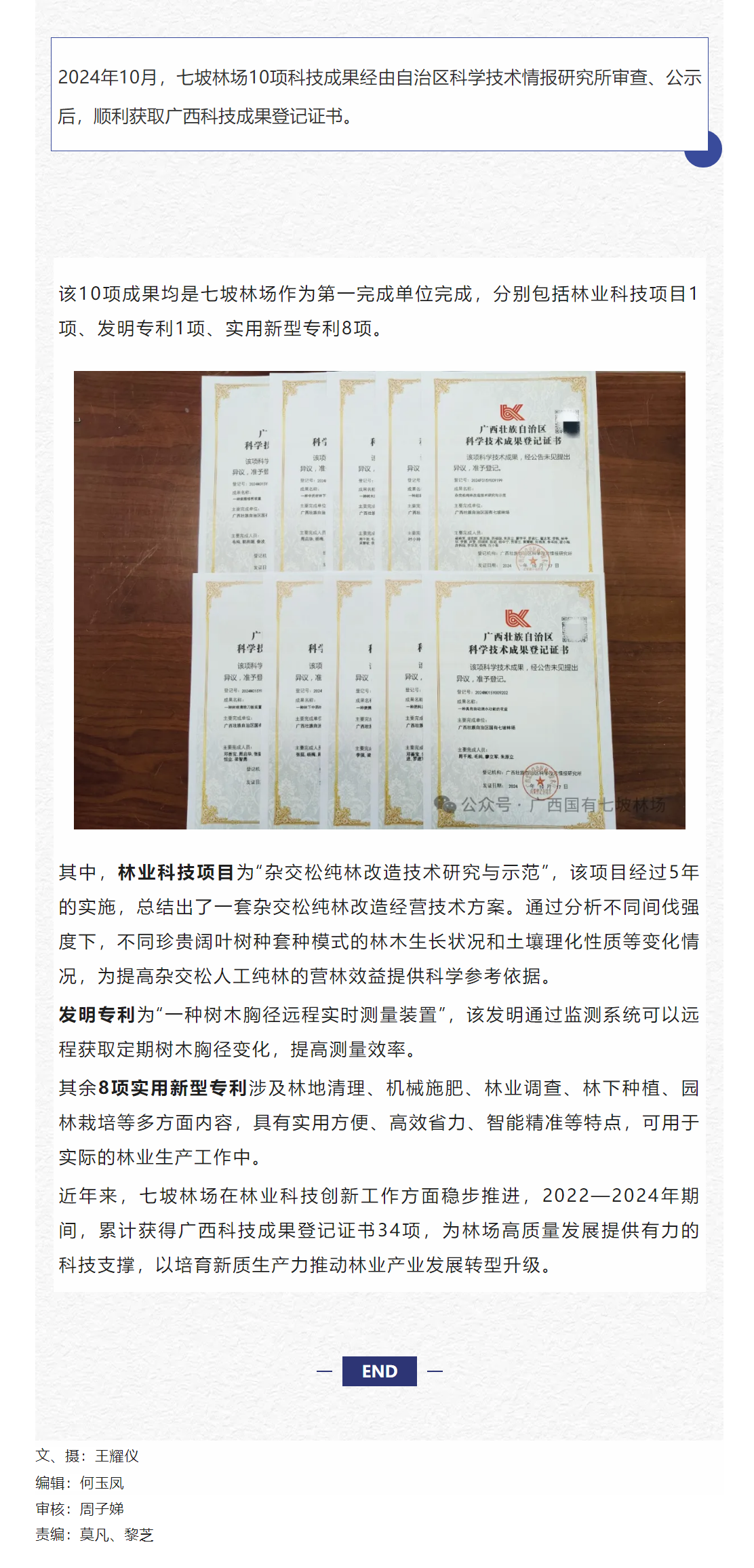 七坡林场10项科技成果顺利获取广西科技成果登记证书