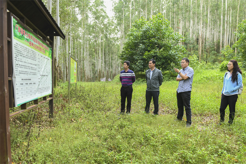 调研组在七坡分场立新站考察大径材培育。左二为莫继有副场长、右二为毛炎新处长