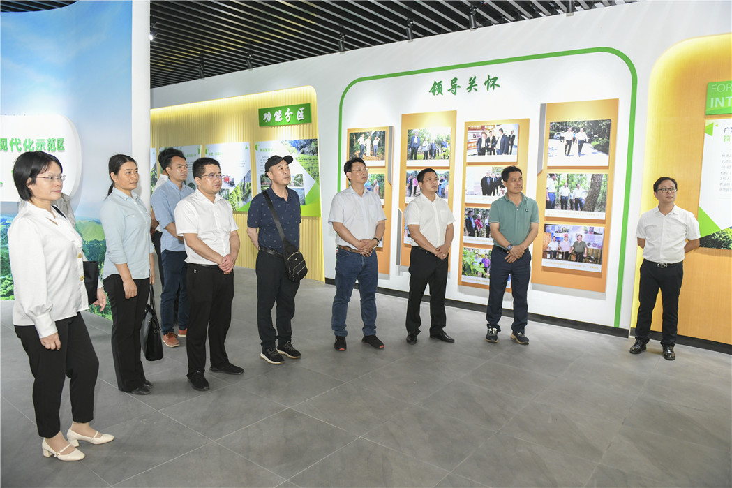广西农业科学院院长助理黄强(前排左四)、成果转化处处长车江旅(右四)参观七彩七坡林下经济产业现代示范区。七坡林场常务副场长朱兵(前排左三)、副场长莫继有(右二)陪同。