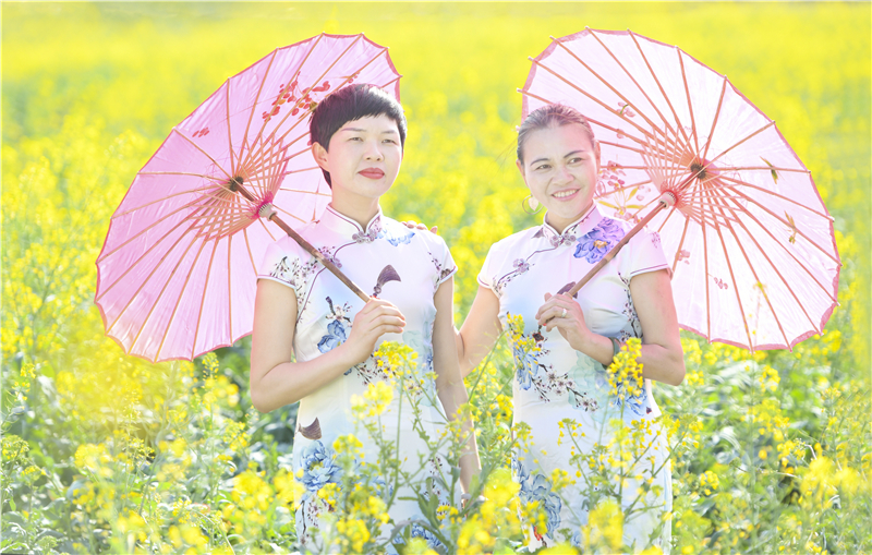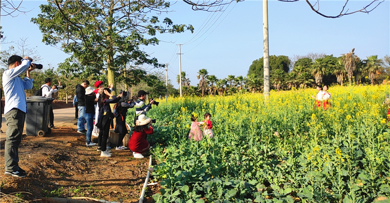 近日,南宁市气温回升,春暖花开,广西台湾花卉产业园油菜花浸染2月,遍地尽是“黄金甲”。
