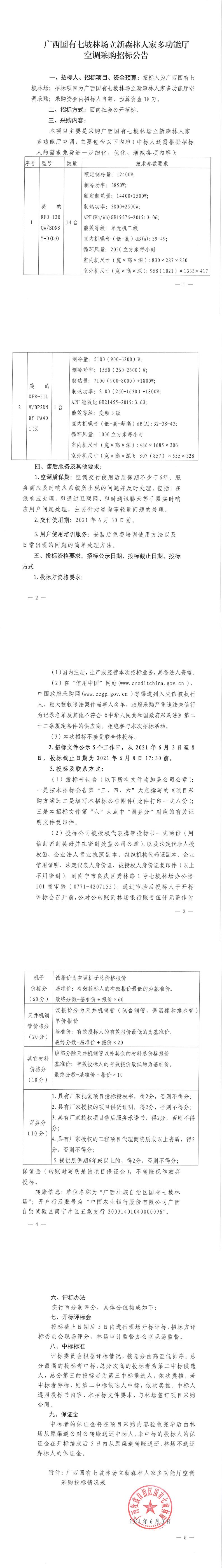 广西国有七坡林场立新森林人家多功能厅空调采购招标公告