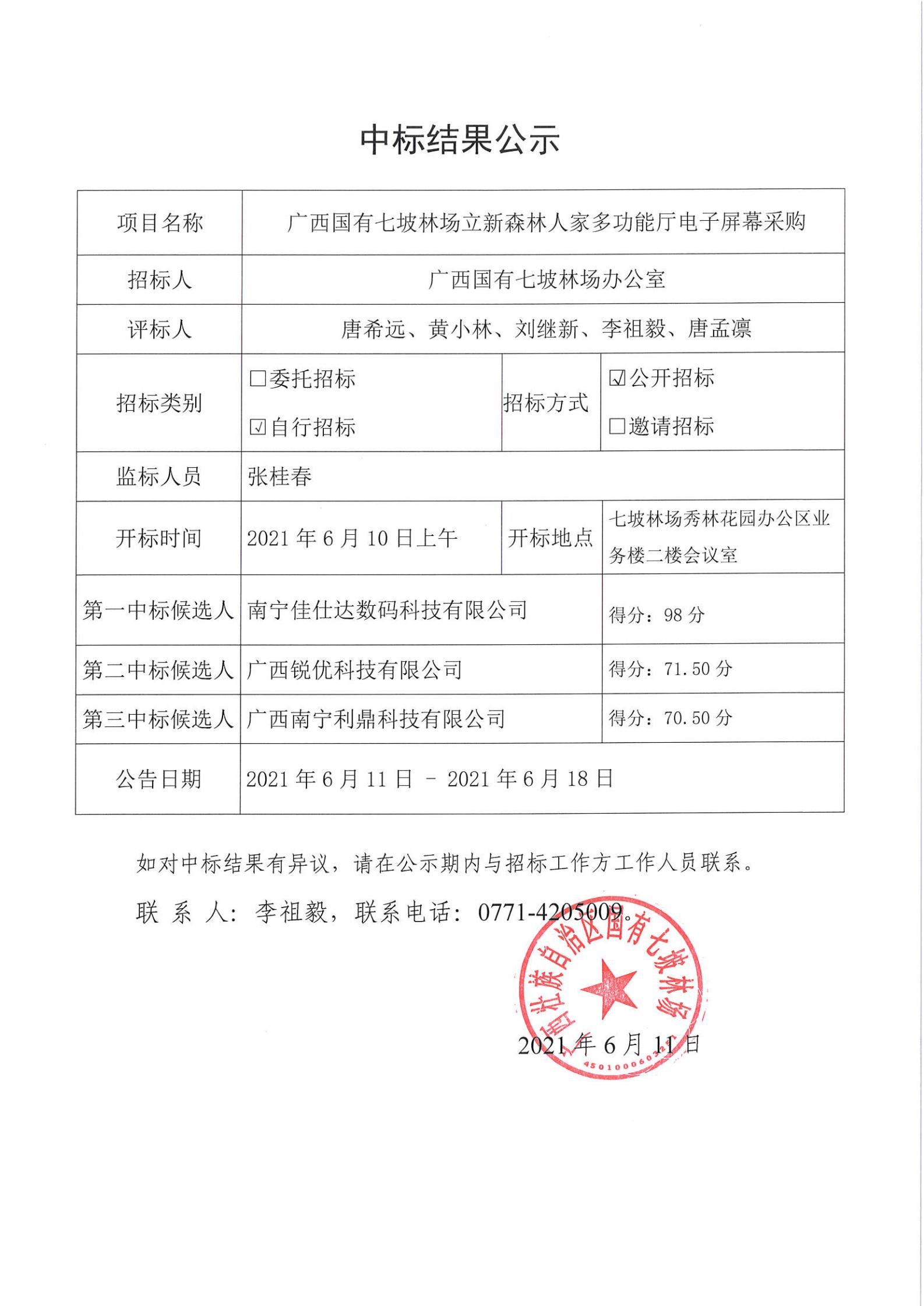 广西国有七坡林场立新森林人家多功能厅电子屏幕采购中标结果公示