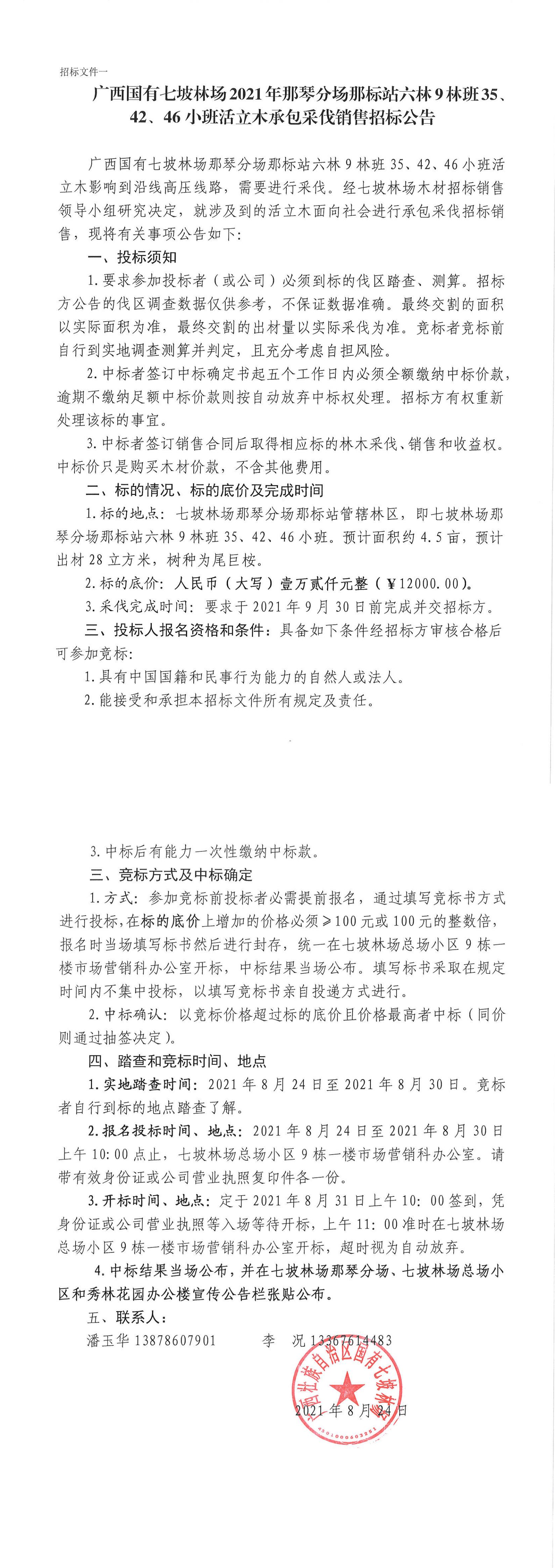 广西国有七坡林场2021年那琴分场那标站六林9林班35、42、46小班活立木承包采伐销售招标公告