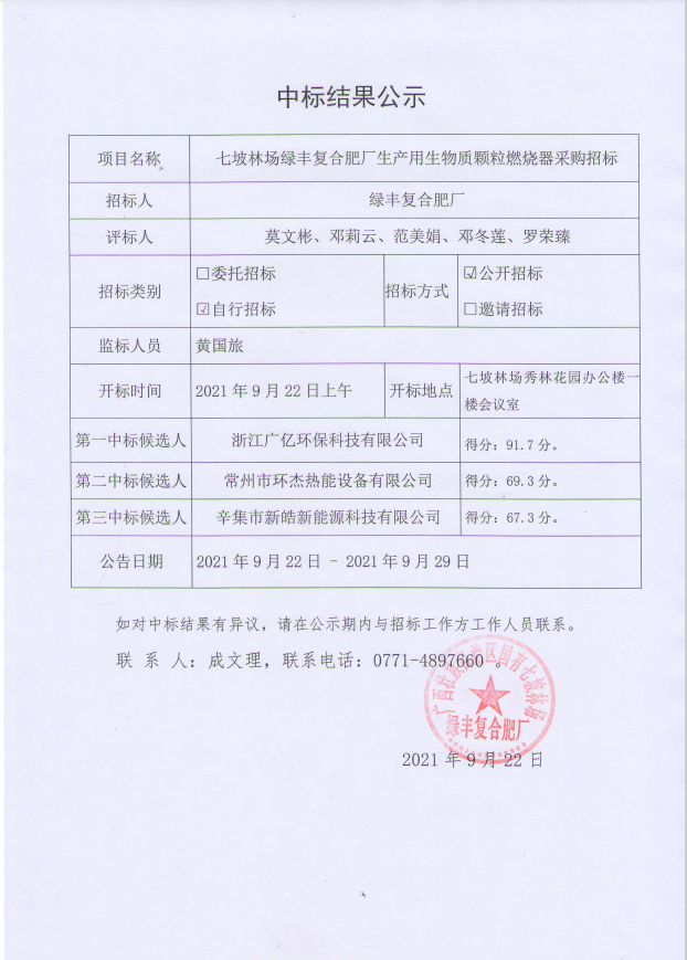 广西国有七坡林场绿丰复合肥厂生产用生物质颗粒燃烧器采购中标结果公示