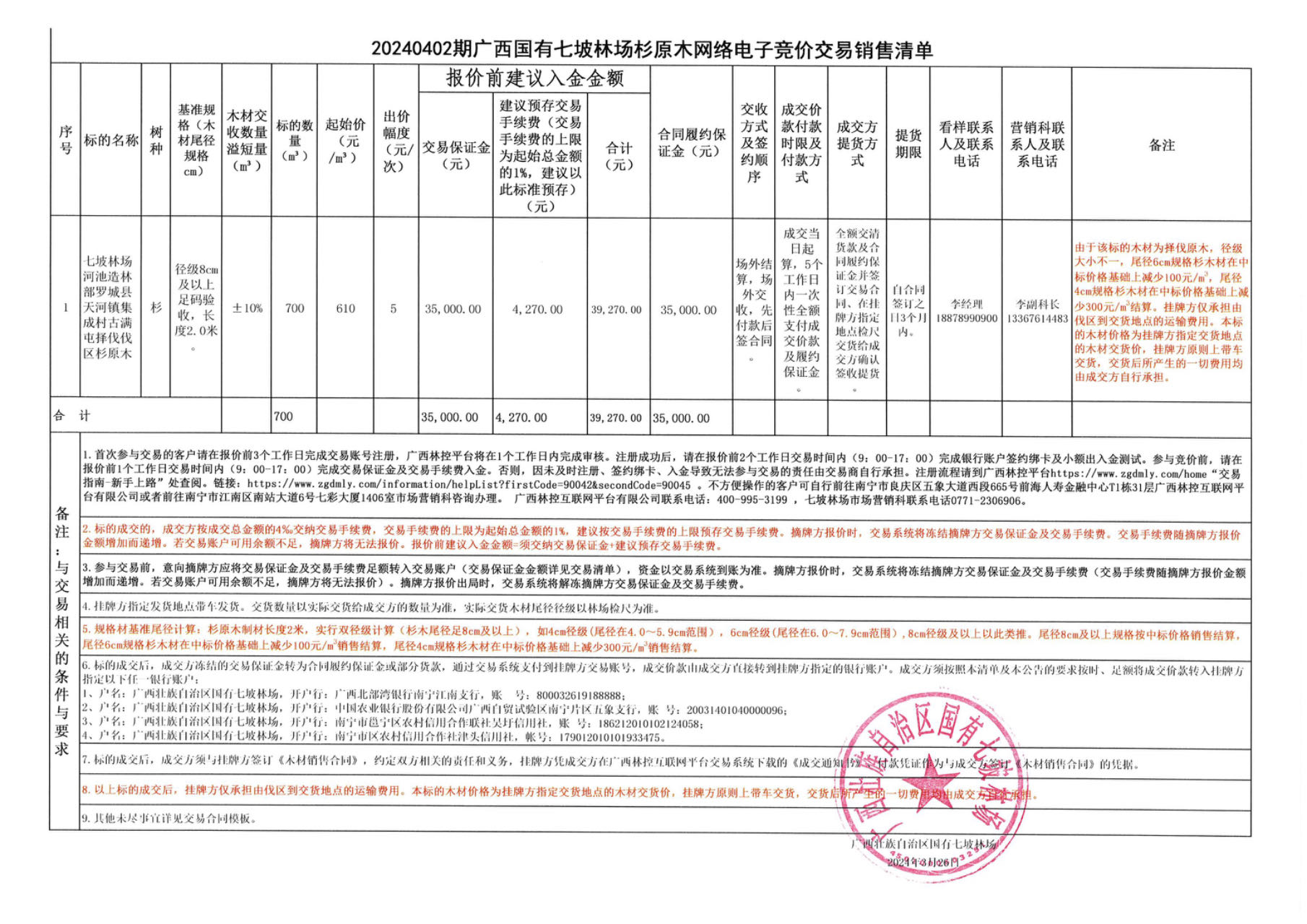 20240402期广西国有七坡林场杉原木网络电子竞价交易销售清单