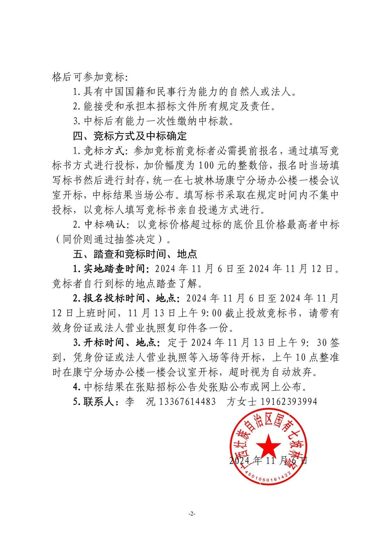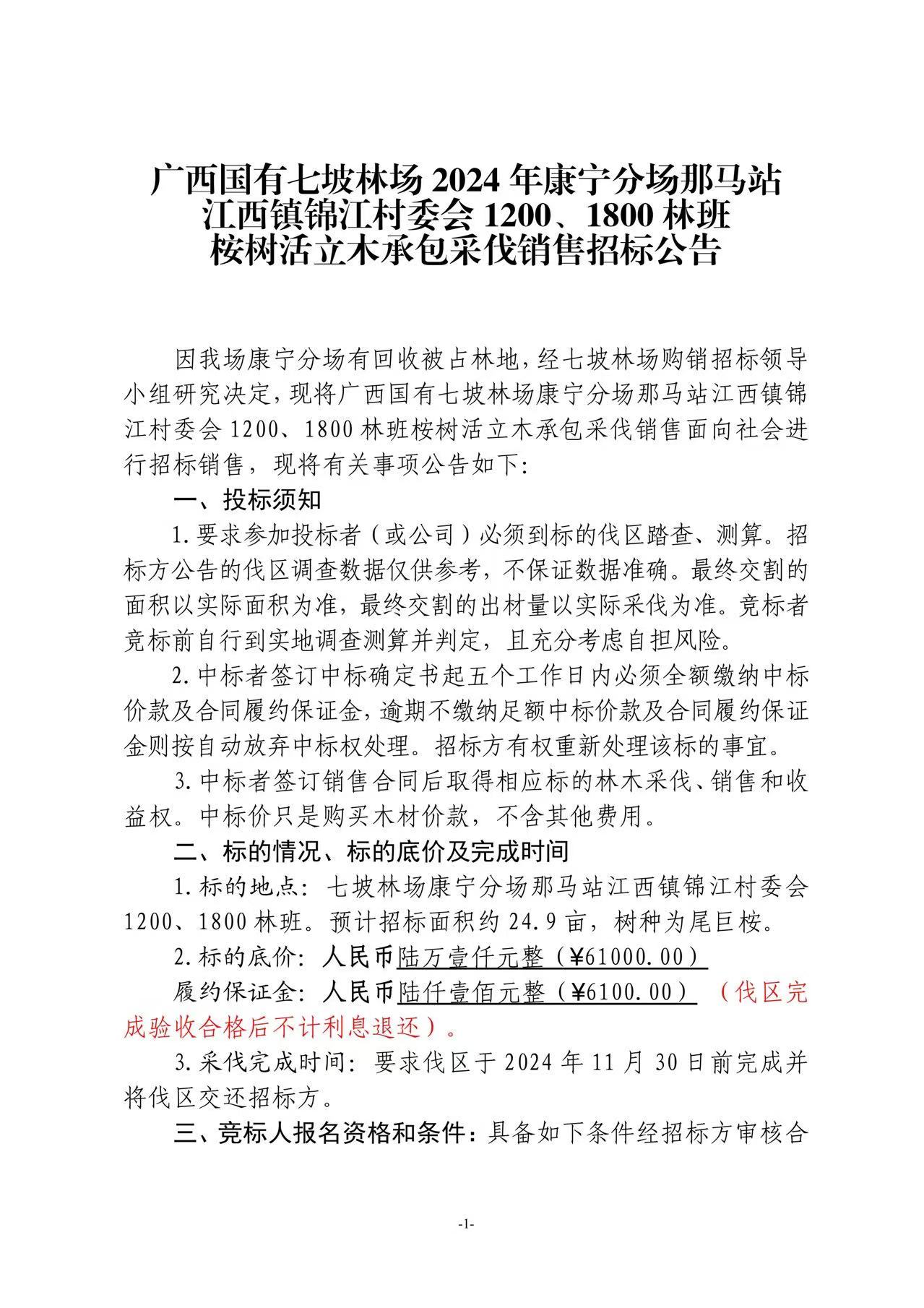 广西国有七坡林场2024年康宁分场那马站江西镇锦江村委会1200、1800林班桉树活立木承包采伐销售招标公告