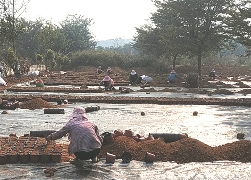 鸡血藤苗是林场2021年林下经济示范区的推广用苗,林科所现已完成铺设防草地布、调配培养基质,目前正紧张有序地进行装营养杯工序。