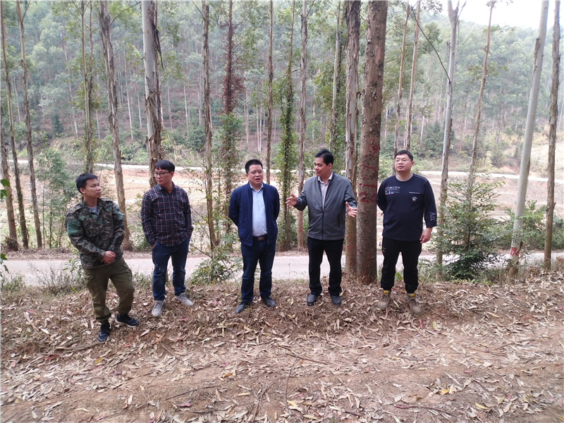 朱兵常务副场长(左三)、莫继有副场长(右二)在新桥分场林地调研