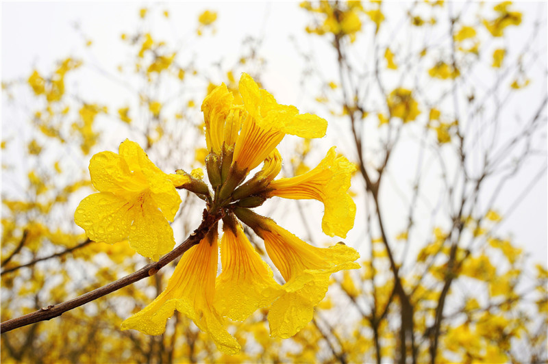 黄花风铃木花色金黄,先开花后长叶,由于花冠形似风铃,故而称之为“风铃”。尤其是当微风吹拂时,轻盈的花枝在风中摇曳,恰如一串串风铃随风起舞,灿烂的花朵蔓延成一片金色的海洋。