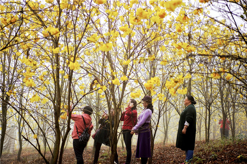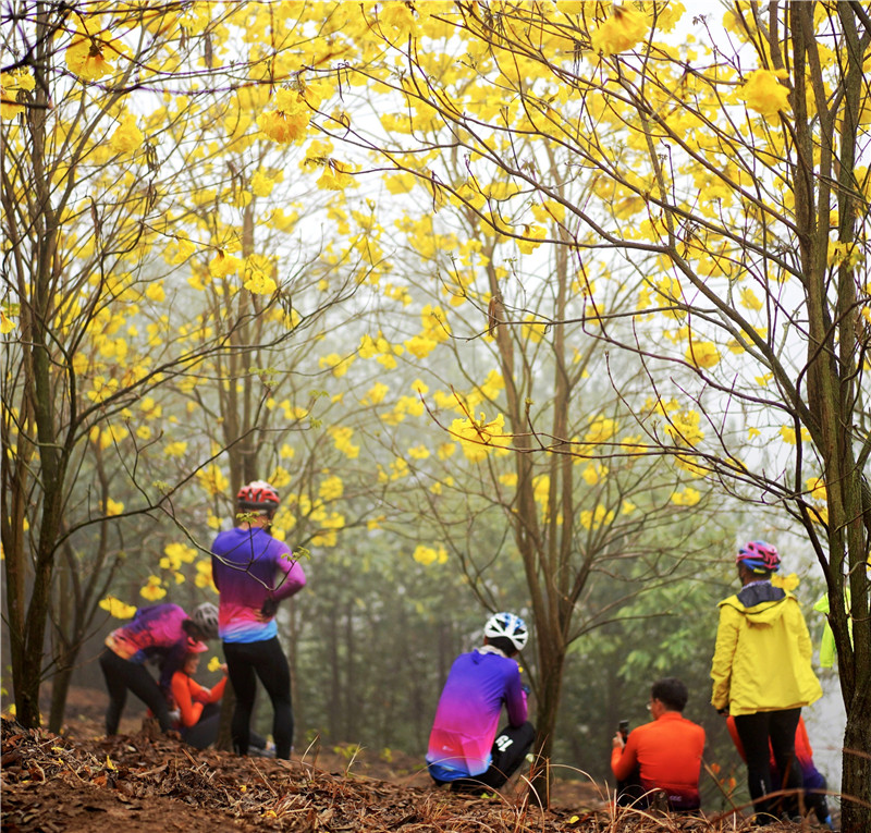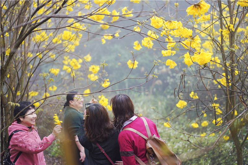 2021年2月底,七坡林场吴圩总场后山黄花风铃进入盛花期,一团团、一簇簇的黄花如风铃般挂满枝头,色艳如金,美得醉人,形成了一道独特、靓丽的风景线,引来众多游人争相观赏,拍照打卡,享受置身花海的闲适,一起倾听花开花落的声音。