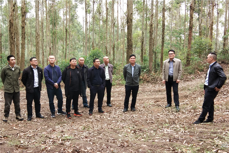 参观三门江林场国储林建设示范基地现场。三门江林场常务副场长余平福(右二)、七坡林场副场长莫继有(右三)