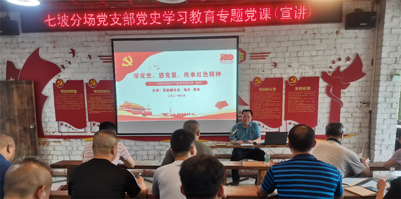 2021年6月29日,七坡林场场长蒋林到七坡分场党支部上《学党史 感党恩 传承红色精神》专题党课,七坡分场党员及管理员共40人参加。