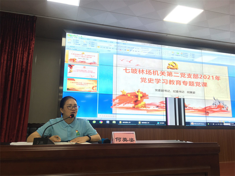 2021年6月28日,七坡林场机关第二党支部在秀林办公楼二楼会议室开展党史学习教育系列主题党日活动。活动紧扣“感党恩 跟党走”主题,将“党史学习教育(宣讲)专题党课”“红色经典诗词诵读”“党史知识答题”“党史学习读书会”等活动贯穿始终,引导党员干部争当学党史、讲党史、懂党史、用党史的表率,学史明理,学史增信,学史崇德,学史力行,扎实推进支部党史学习教育走深走实。