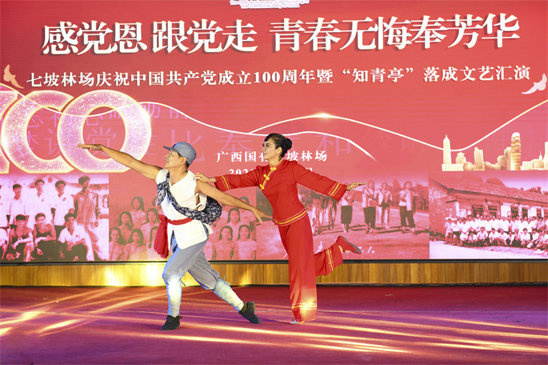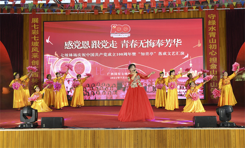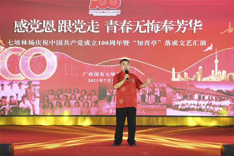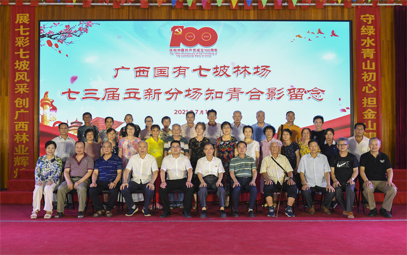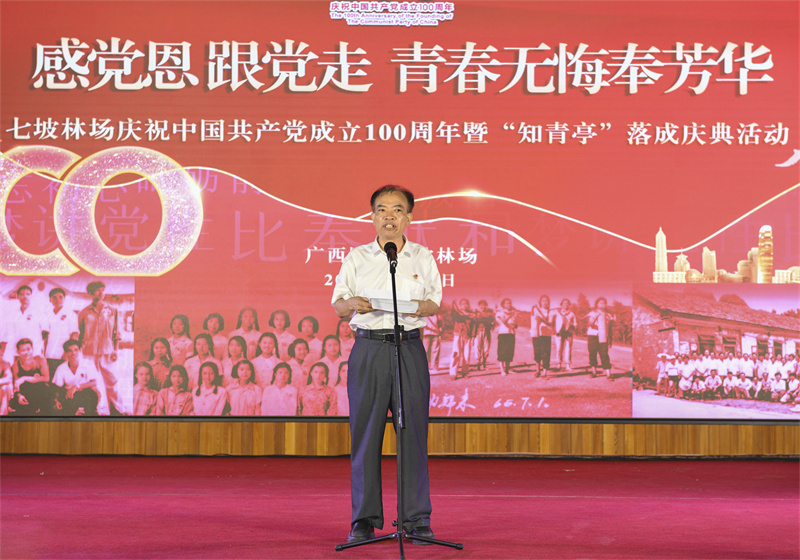 青春热血洒七坡,青山绿水叙情缘。7月10日,七坡林场在立新森林人家举行“感党恩 跟党走 青春无悔奉芳华”庆祝中国共产党成立100周年暨“知青亭”落成庆典活动,曾在林场工作过的350多名知青回到林场参加活动。七坡林场党委书记刘运华参加活动并讲话,常务副场长朱兵,广西“两山”研究院副院长、七坡林场正处级干部陈文军,工会主席李怡毅参加活动。