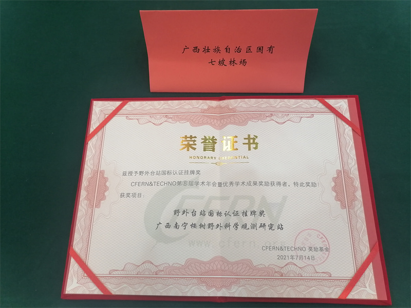 在2021年7月12日—7月15日召开的CFERN&TECHNO第⑧届学术年会暨优秀学术成果奖励大会上,由七坡林场与广西林科院共建的广西南宁桉树野外科学观测研究站(以下简称南宁桉树生态站)荣获“野外台站国标认证挂牌奖”。