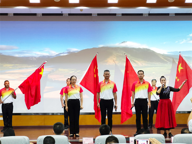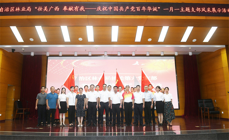 活动在局机关第六党支部《跟着共产党走》的歌声中拉开序幕。活动邀请了全国最美推广员、第四届“中国林业产业突出贡献奖”获得者、岑溪市软枝油茶种子园副场长吴艺梅做先进事迹报告,集体观看了支部风采展《壮美广西 奉献有我》。活动中,七坡分场党支部表演了歌舞+朗诵《百年历史守初心》、局机关第六党支部则带来朗诵《火红的七月》和访谈表演《牢记初心 砥砺前行》等节目。最后,参加活动的28名党员集体唱响《我们走在大路上》。