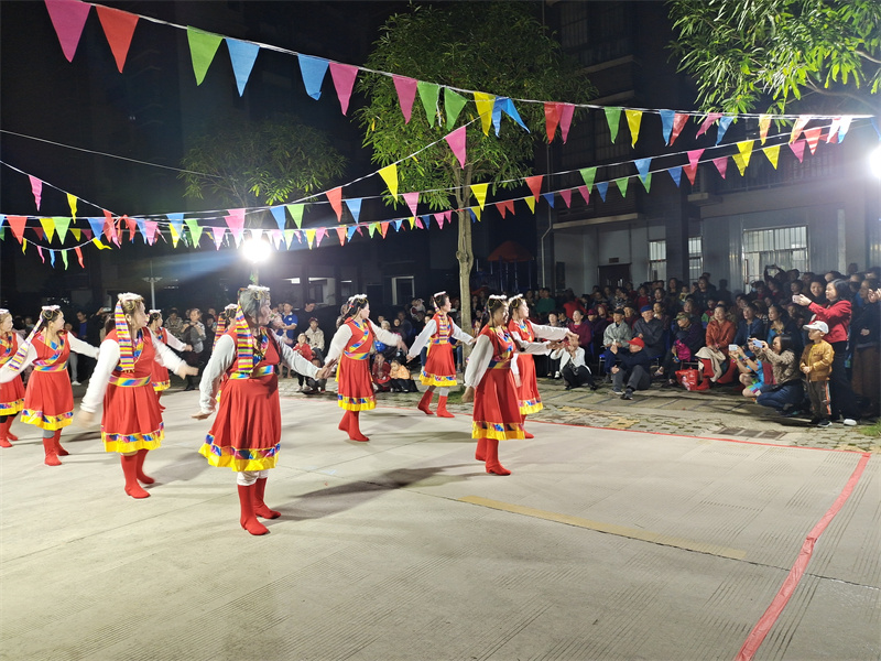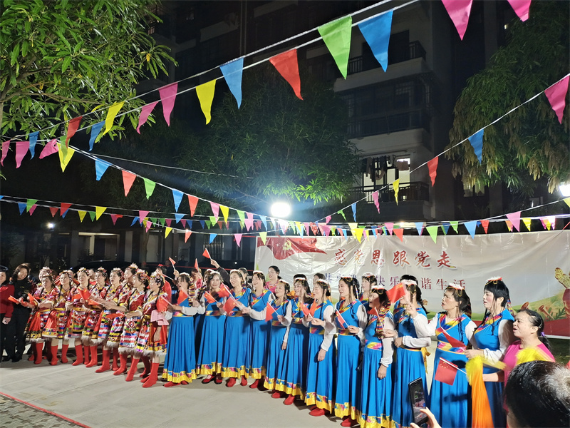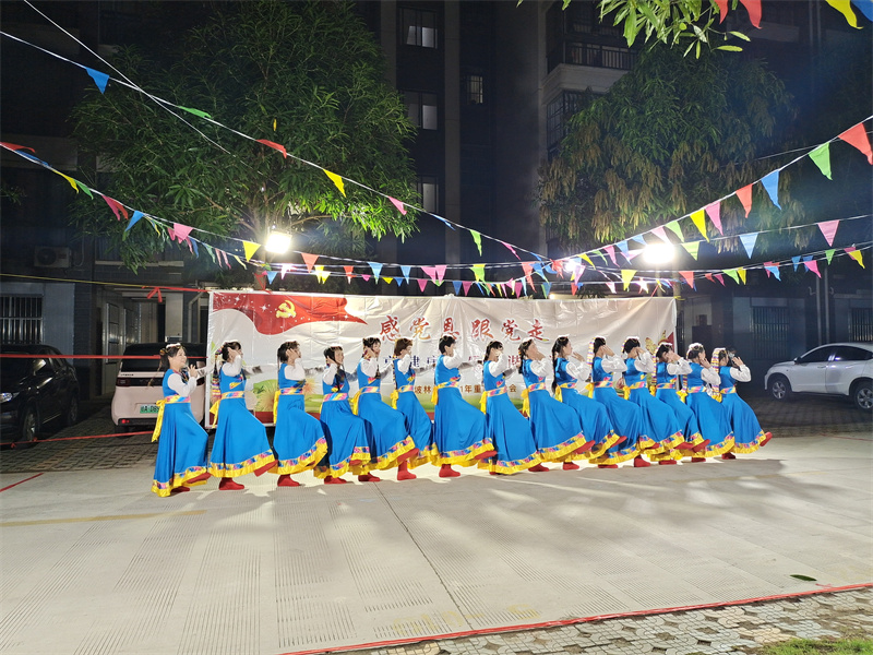 晚会在群舞《在希望的田野上》拉开序幕,晚会节目均由离退休职工编排演出,有如梦如幻的团扇舞、俏皮的伦巴、深情的演唱等等,丰富多彩,获得观众一阵阵掌声。晚会上还设置了党史场史有奖知识问答环节,大家争先恐后的举手答题,将活动推向了高潮。晚会吸引了小区内外200多名观众驻足观看,最终在大家齐唱《我和我的祖国》歌声中落下帷幕。
