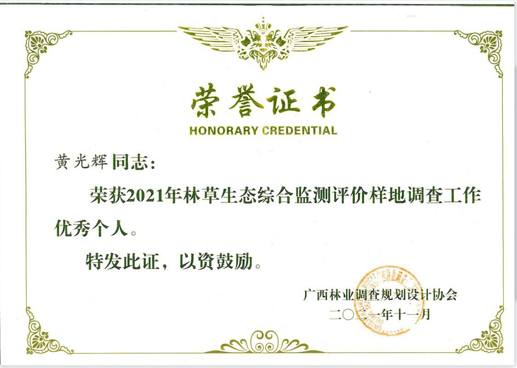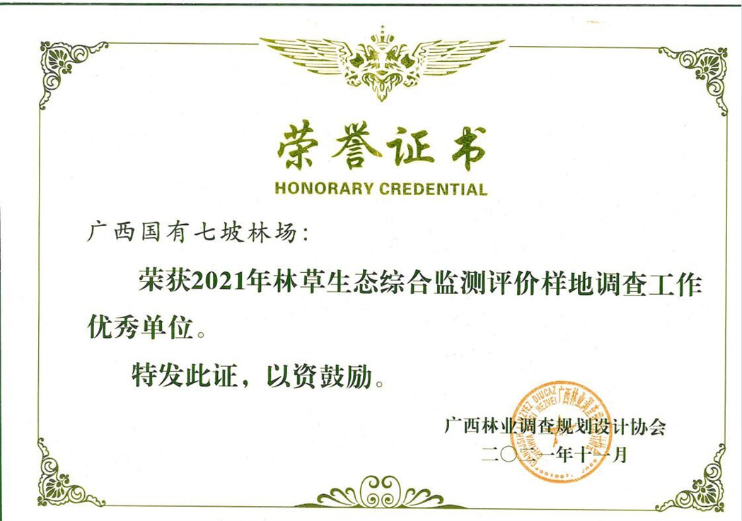 2021年11月23日,全区2021年森林资源管理工作会议在南宁召开。会上,七坡林场荣获“广西2021年林草生态综合监测评价样地调查工作优秀单位”荣誉称号,设计队队员黄光辉获“优秀个人”荣誉称号。