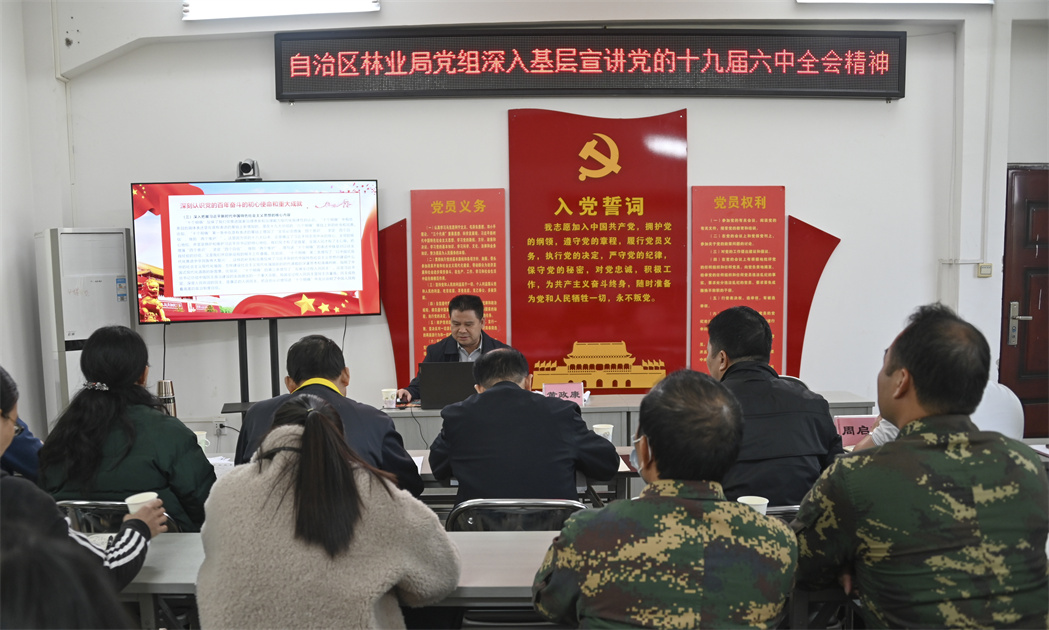2021年12月7日,自治区林业局副局长黄政康参加了局机关第六党支部与七坡分场党支部共同开展的“转作风、抓落实、促发展”主题党日活动,作了党的十九届六中全会精神宣讲报告,并强调要学好、领会好全会精神,创新发展思路,高质量推动林场的发展。