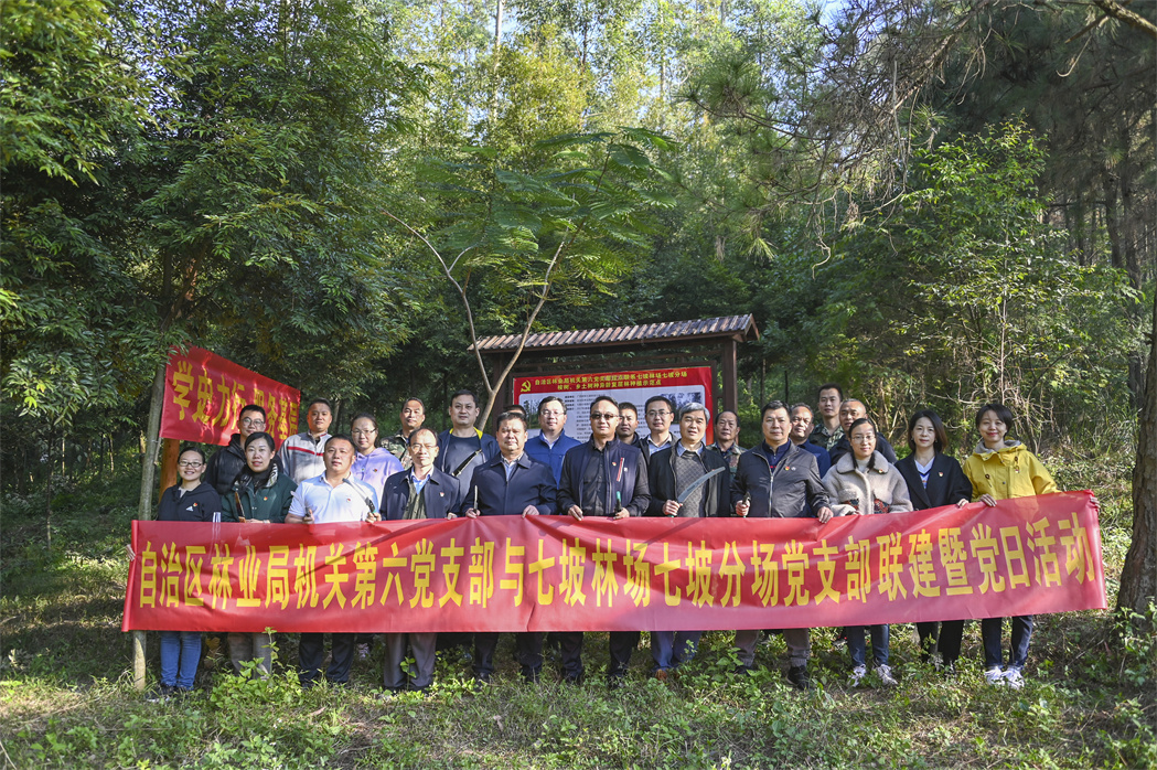 自治区林业局机关第六党支部书记、资源处处长黄强,林业技术推广站站长廖家怀,七坡林场党委书记刘运华、副场长周启华及两支部党员共33人参加活动。