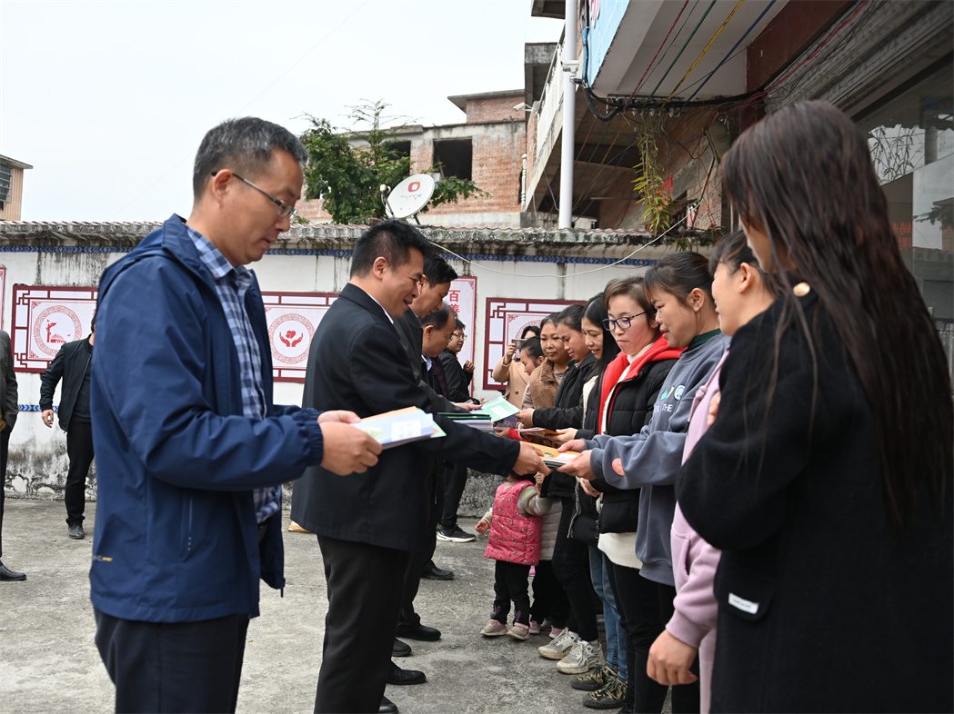 陆志星副局长(左二)为村民代表发放林业推广技术资料。