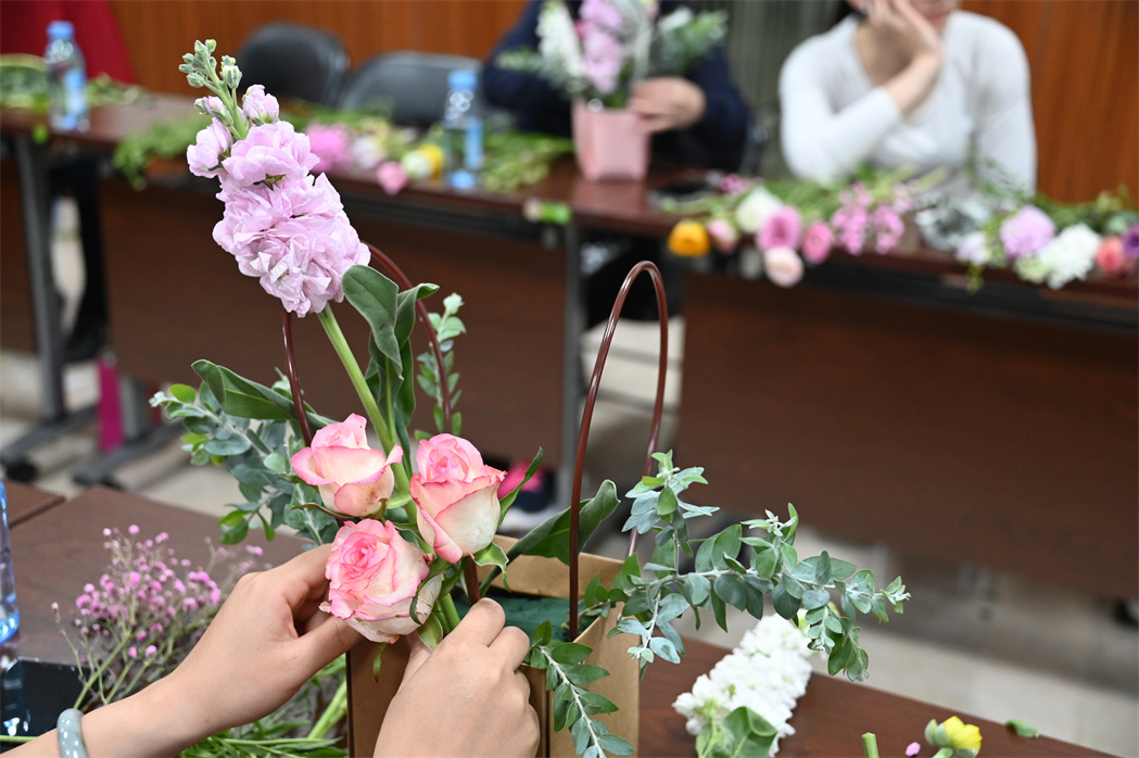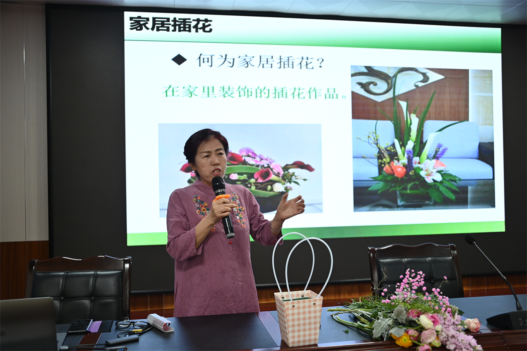 插花艺术培训现场,花香四溢、洋溢着春天的气息。广西花卉协会插花花艺分会会长吴玉华教授给大家讲授了家居插花艺术基本知识,重点讲解插花的造型、色彩、搭配等,并现场进行插花示范。女职工们边看边学,拿起剪刀,修修剪剪,享受插花艺术创作带来的快乐。一篮篮漂亮的插花作品展现在大家面前,大家对自己的作品爱不释手,纷纷合影留念。