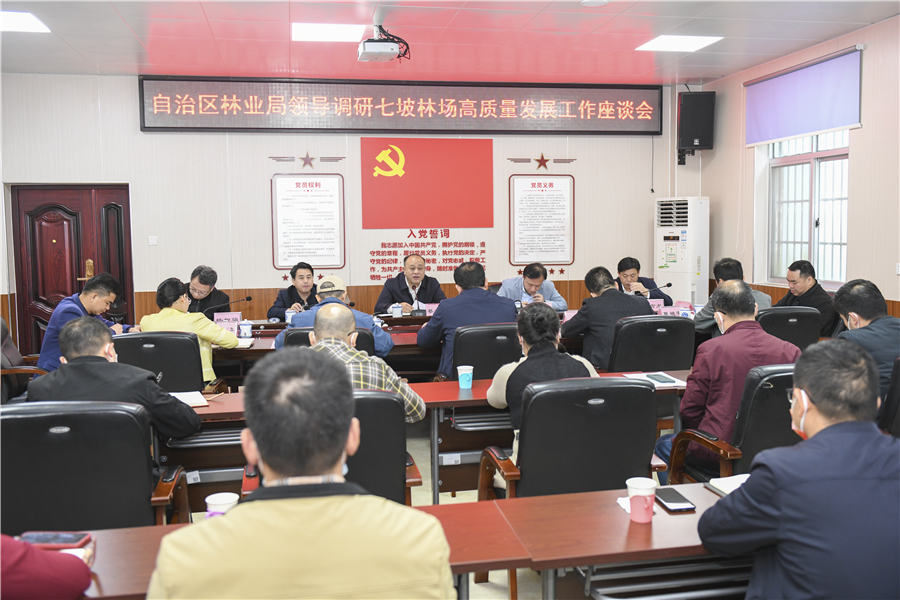自治区林业局二级巡视员冷光明,办公室主任施福军,林场种苗处处长樊吉尤,办公室副主任杨智强,七坡林场领导班子及相关部门负责人参加座谈会。