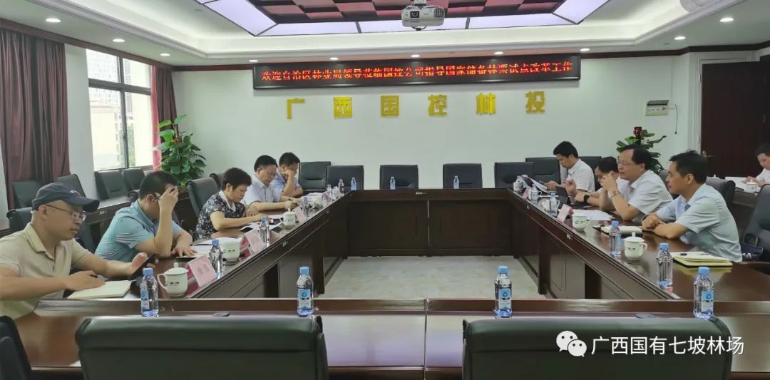 2022年6月6日,广西国家储备林林票试点改革工作座谈会在广西国控林业投资股份有限公司召开。自治区林业局党组成员、副局长李凤云主持会议。七坡林场场长蒋林、副场长莫继有代表林场参加会议。