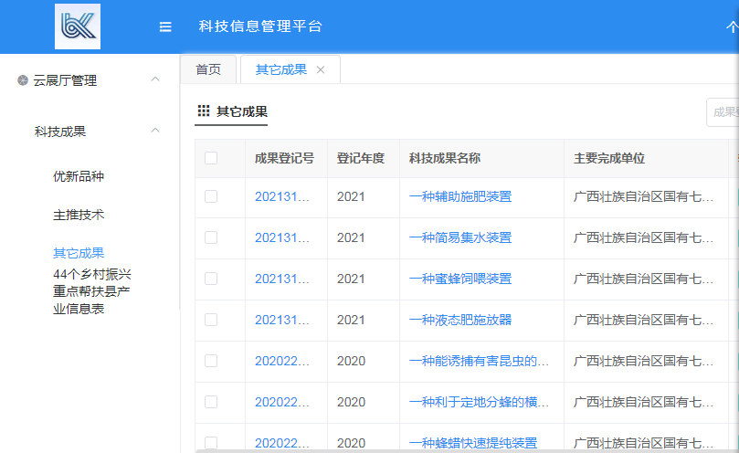 该八项科技成果分别为一种辅助施肥装置、一种简易集水装置、一种液态肥施放器、一种蜂蜜饲喂装置、一种能诱捕有害昆虫的蜂箱隔板、一种利于定地分蜂的横向组合式蜂箱、一种蜂蜡快速提纯装置、一种采集坡面地表水的固定装置,均是七坡林场作为第一完成单位成功登记。现已成功入选首批农业科技成果,将面向全区 44 个乡村振兴重点帮扶县推广,供各科技主管部门和全区乡村科技特派员以及国家乡村振兴重点帮扶县科技特派团成员选择应用。