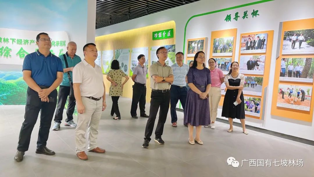 验收监测组察看示范区综合展示厅。前排右二为自治区林业局二级巡视员、产业处处长冷光明,前排右一为广西农村经济经营管理站党支部书记、副站长、一级调研员黄嫦慧,前排左二为七坡林场副场长周启华。