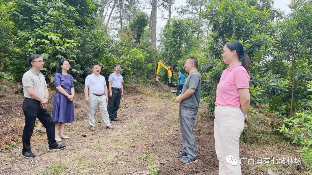 验收监测组察看示范区标准化栽培展示园。右三为自治区林业局二级巡视员、产业处处长冷光明,右四为广西农村经济经营管理站党支部书记、副站长、一级调研员黄嫦慧,右一为七坡林场副场长周启华。