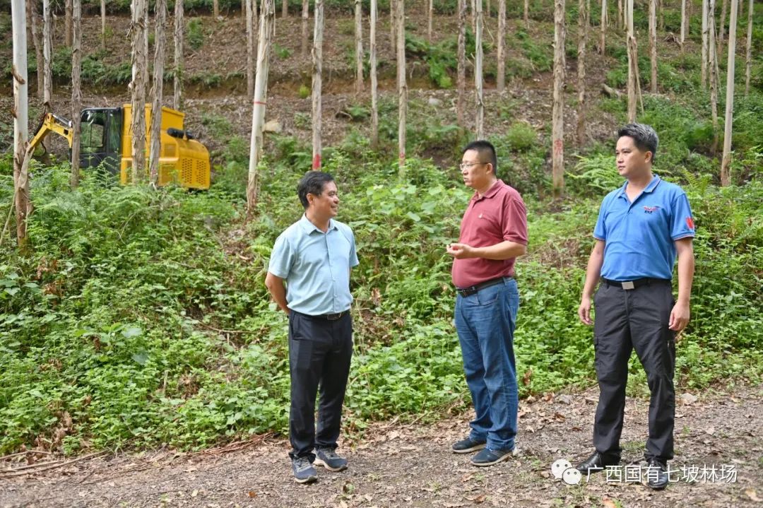 2022年8月23日下午,自治区农机中心试验鉴定部处长叶长青到七坡林场调研指导林业机械化工作,七坡林场副场长莫继有陪同调研。