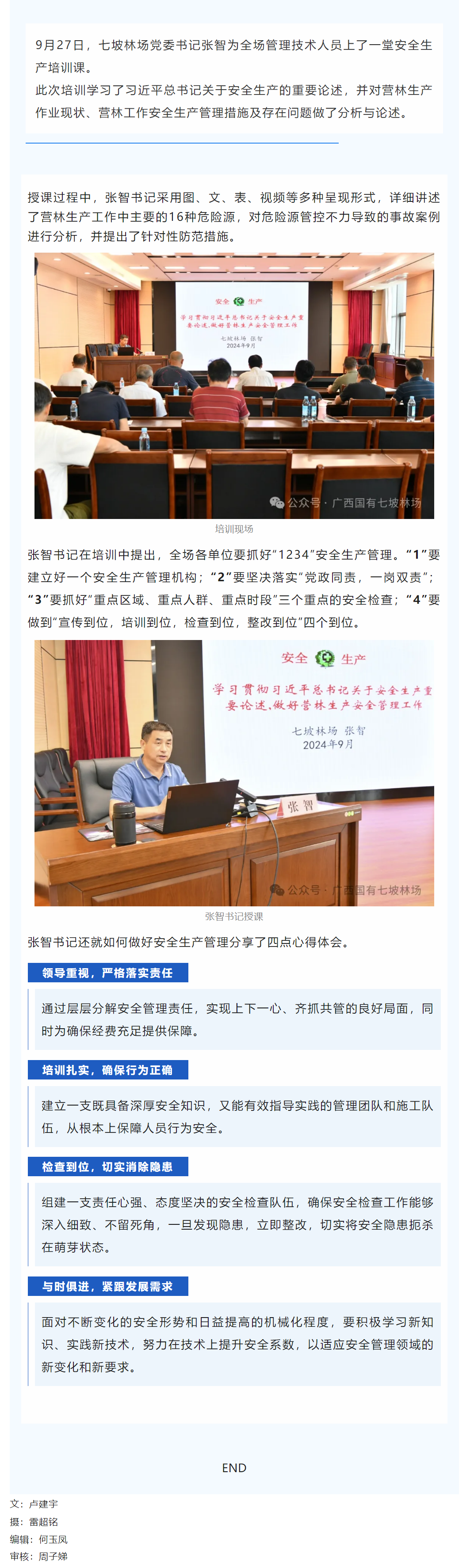 抓好“1234”安全生产管理 护航七坡高质量发展——七坡林场党委书记张智上安全生产培训课