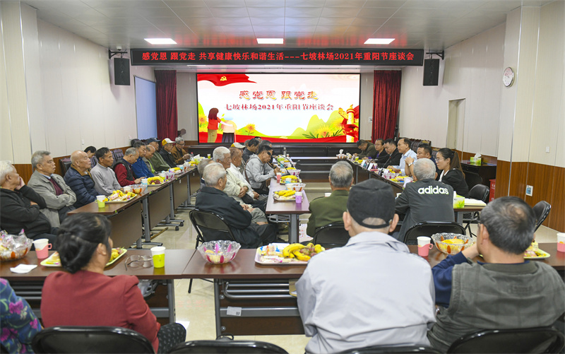 10月14日,七坡林场召开了“感党恩 跟党走”2021年重阳节座谈会,大家欢聚一堂共度重阳佳节,共话七坡发展。场领导、相关部门负责人及离退休职工代表共40多人参加座谈会,场工会主席邓善宝主持会议。