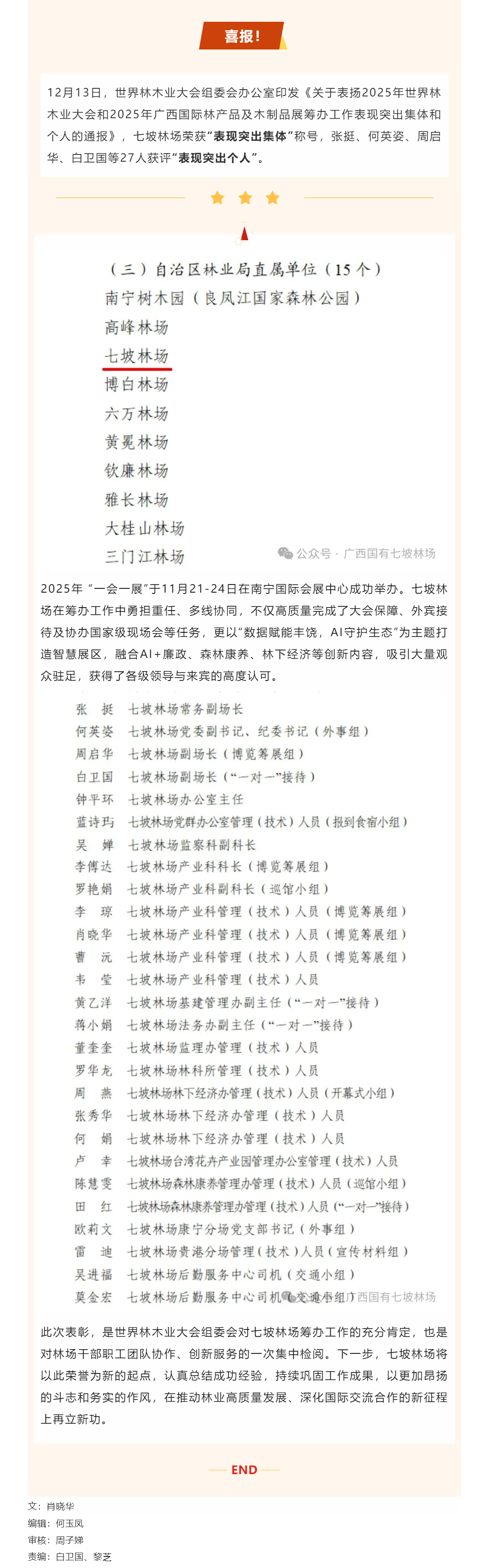 七坡林场荣获“2025年世界林木业大会和2025年广西国际林产品及木制品展筹办工作表现突出集体”称号