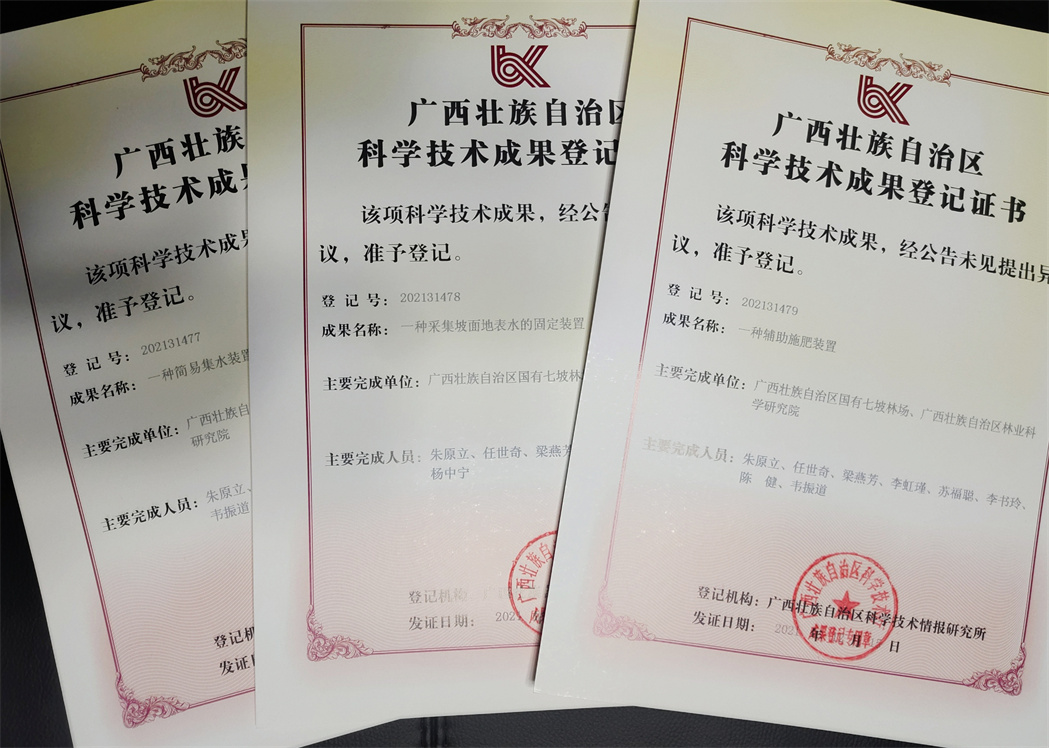 2021年12月15日,七坡林场三项实用新型专利成功获得广西壮族自治区科学技术成果登记。