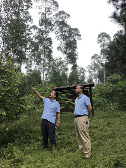 2019年10月13日,自治区林业局林场苗圃处丁允辉处长带队到我场七坡分场那丹站2、5林班调研大径材培育、异龄复层混交林、近自然林改造等造林模式,场长陈文军针对改造方式及培育方法作主要介绍,一是严格遵循砍密留疏、砍劣留好、保留分布均匀的原则,把关择伐细节;二是以优良种源培育珍贵树种苗木,结合桉人工林经济价值较高、生态效益差,而乡土珍贵树种经济价值高、生态功能较强、但经济效益迟缓等问题,相辅相成实现“以短养长、长短结合、经济可行、生态高效”的目的;三是培育目标胸径40cm以上的高价值乡土珍贵树种和桉树大径材,并逐步将林分由单层同龄林导向异龄复层林,实现森林可持续经营和多功能效益。