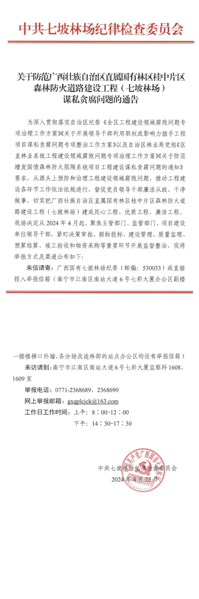 关于防范广西壮族自治区直属国有林区桂中片区森林防火道路建设工程(七坡林场)谋私贪腐问题的通告